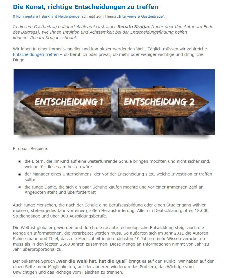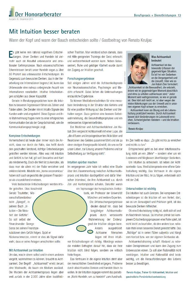 In diesem Gastbeitrag erklärt Renato Kruljac für das Magazin „Der Honorarberater“, warum Achtsamkeit und Intuition die Entscheidungsqualität verbessern und wie wir lernen, den richtigen Moment für intuitive Entscheidungen zu erkennen.