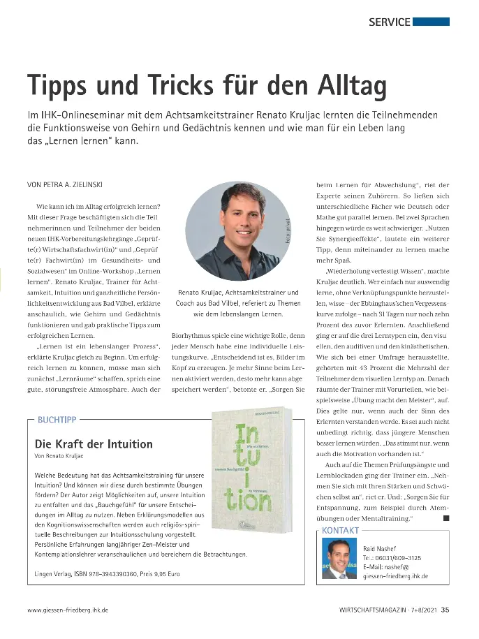 In einem IHK-Online-Seminar zeigt Achtsamkeitstrainer Renato Kruljac, wie Gehirn und Gedächtnis funktionieren und warum Achtsamkeit und Intuition entscheidende Faktoren für nachhaltiges Lernen sind. Der Artikel gibt wertvolle Einblicke, warum Lernen ein lebenslanger Prozess ist und wie Achtsamkeit die Konzentration und Aufnahmefähigkeit verbessert. Zudem erfährst du, wie du durch praktische Methoden effektiver und stressfreier lernen kannst.